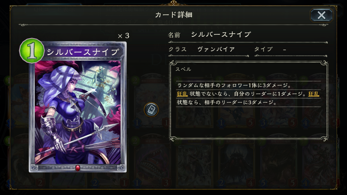 〈シルバースナイプ〉は1コストスペルながらランダムとはいえ3点ダメージが出せる一枚。そして狂乱でなければ自傷1点。狂乱ならば相手リーダーに3点。このデッキは進化したフォロワーで殴って除去が主なので除去札はあんまり入れてませんが、1コストで自傷出来たりリーダーに3点ダメージ出したりなら美味しいとしか言えません。いいのか!?