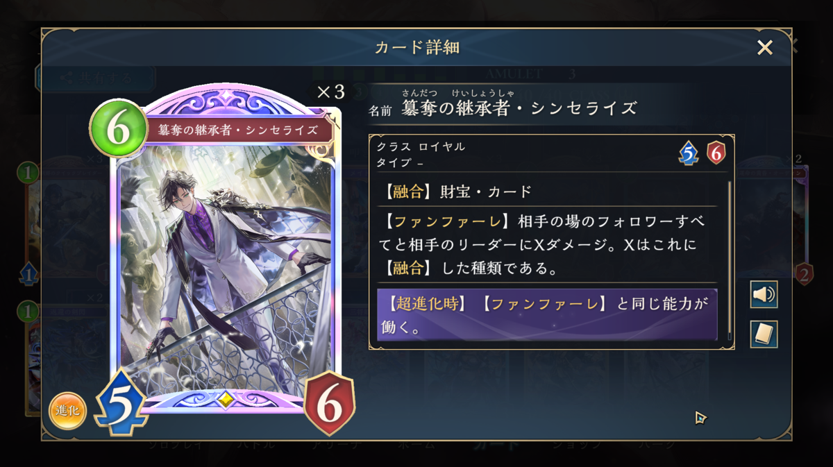 今回は《シリーズ・絶傑》としてロイヤルのフォロワーである〈簒奪の継承者・シンセライズ〉です。レジェンドのフォロワーで6コストの攻5体6。融合持ちで財宝シリーズを融合し、ファンファーレと超進化時にその融合した財宝シリーズの種類数の全体ダメージと相手リーダーにもダメージが入ります。つまり、最大数融合していれば全体4点×2が出せる、という能力になります。