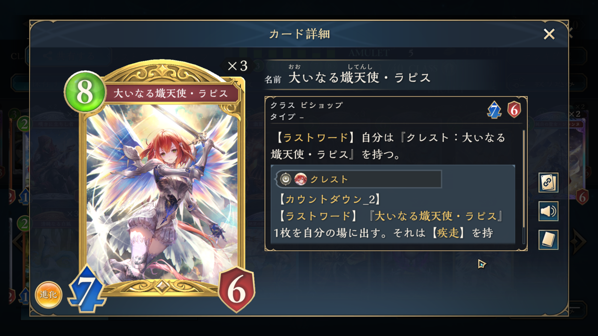 今回のシャドバWB雑カード語りは〈大いなる熾天使・ラピス〉を取り上げます。ゴールドのフォロワーで8コスト攻7体6。ラストワードでクレスト付与し、その効果はカウントダウン2で〈大いなる熾天使・ラピス〉を再び場に出しついでにそれに疾走を付与する、というものです。